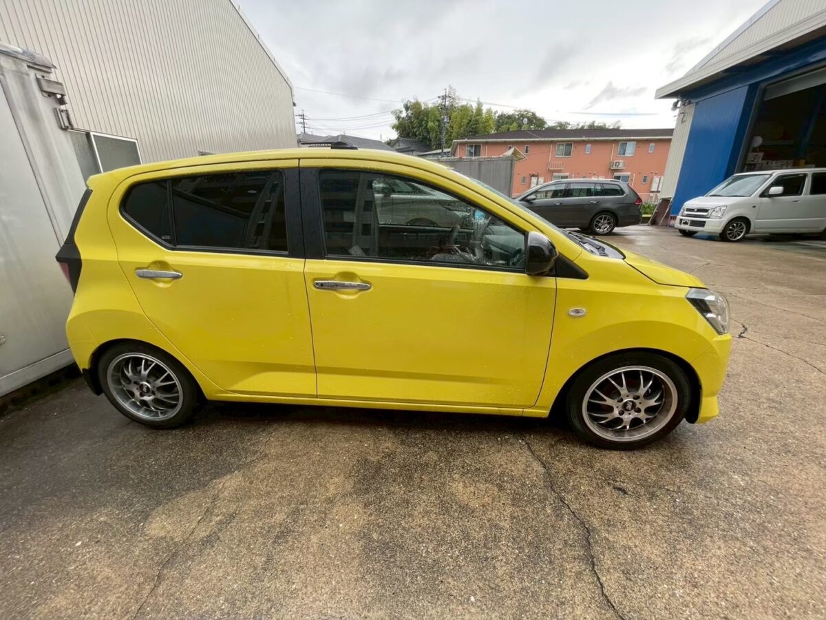 ミラ イースのルーフ、サッシュ、フロントバンパーの一部を塗装にてブラックアウトさせていただきました。
