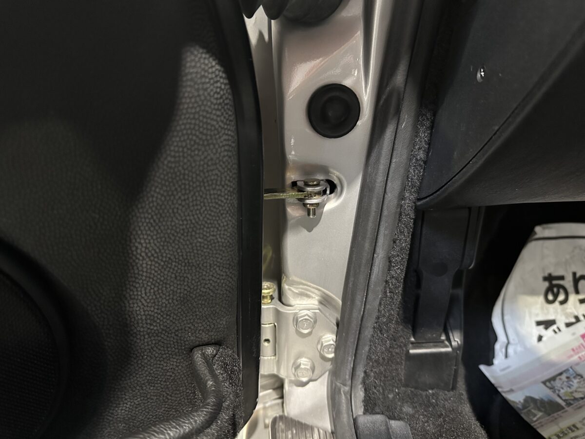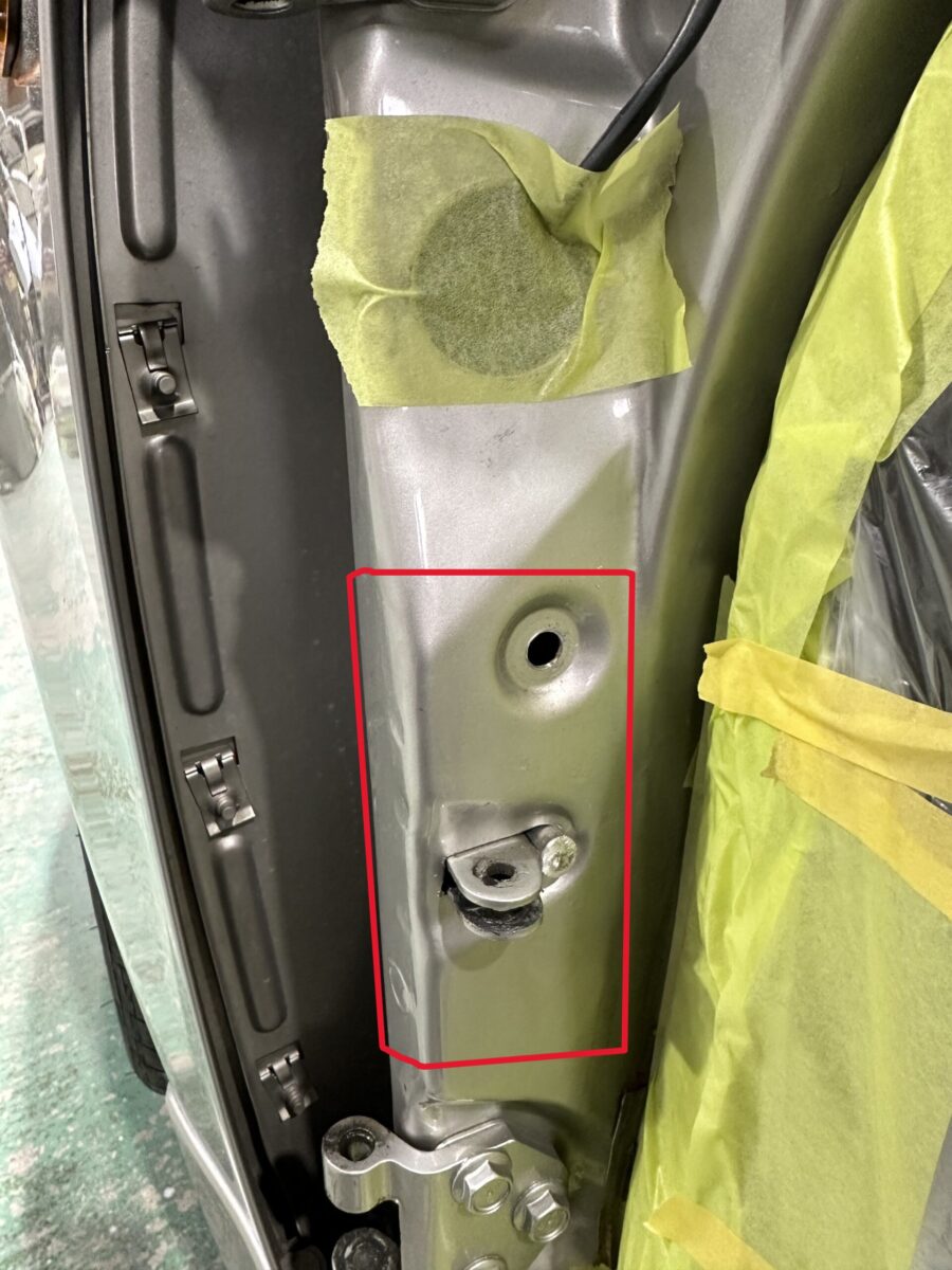 ドアを開けたこの部分です。ドアチェックのピンを差し込むブラケット部分の溶接がドア開閉に伴う経年劣化で取れてしまうんです。特にドアをめいっぱい開けた時にここに負担がかかるので何度も繰り返すうちに溶接が負けてしまいます。開閉回数の多い運転席側は特にです。