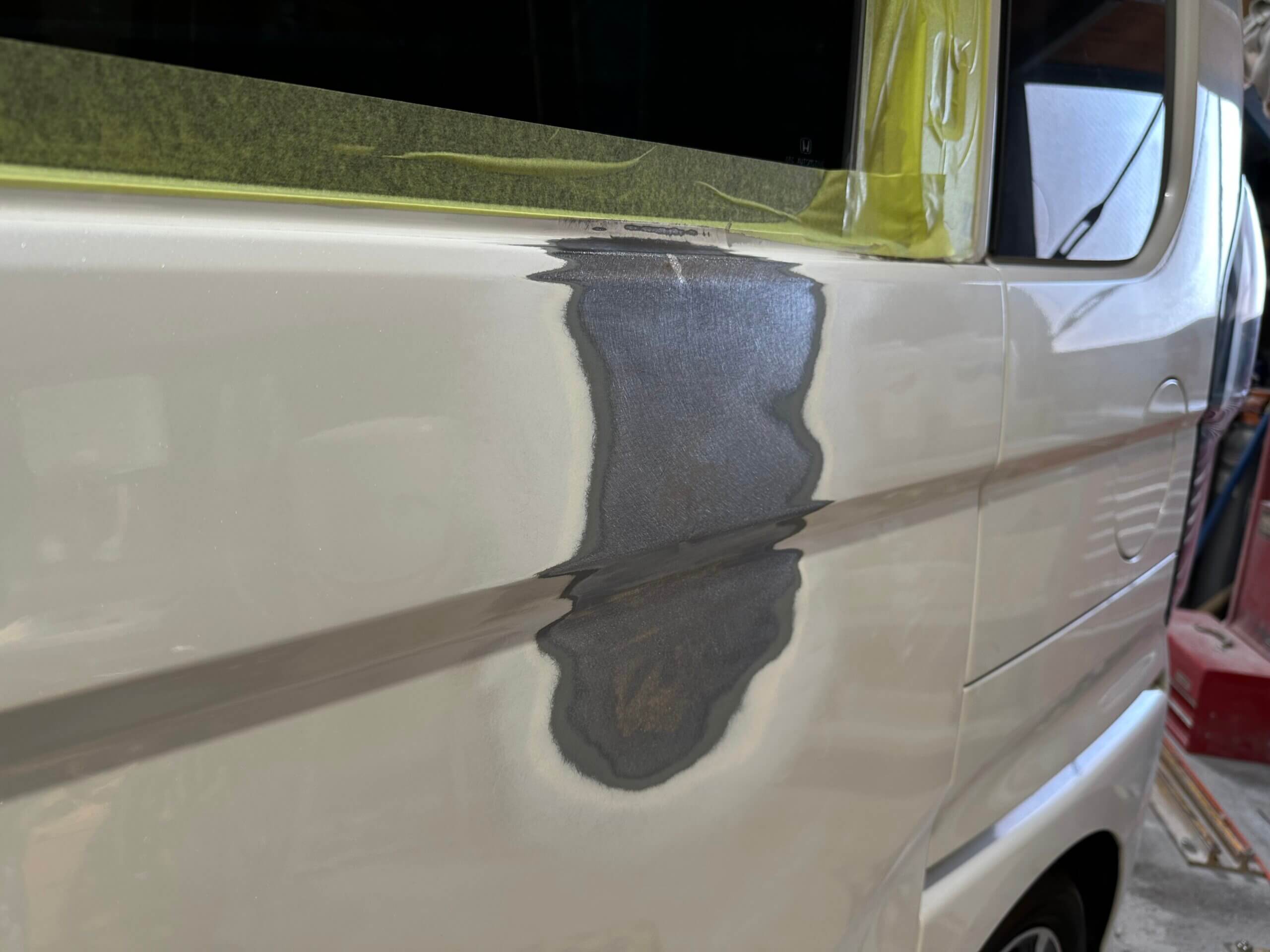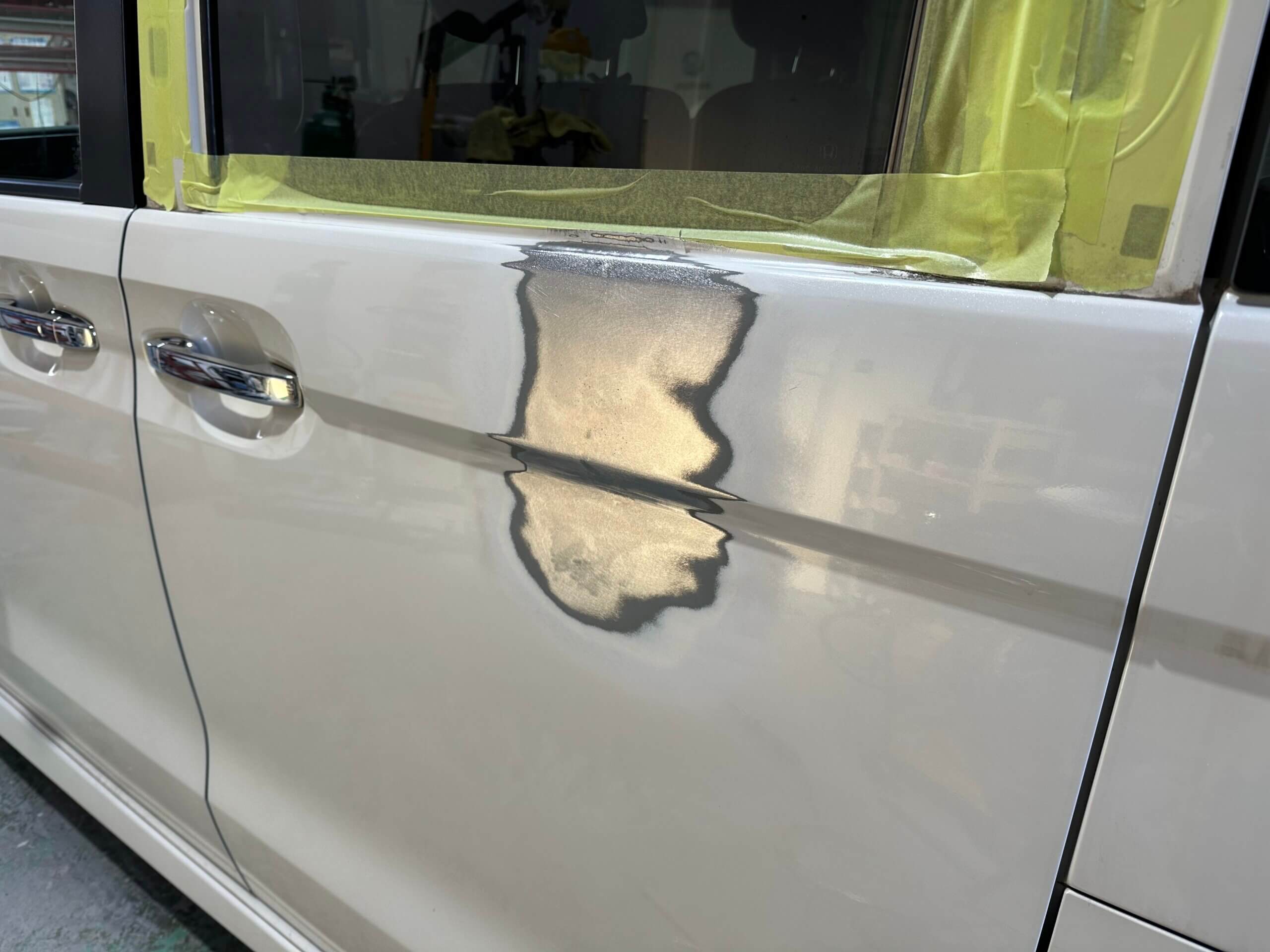 もちろん作業を始めてみて鈑金では綺麗に直らないと判断したらやむを得ず交換を提案させていただくこともありえます。近年の軽自動車のパネルはとても薄く、一度パネルが損傷により伸びてしまうとその歪みを取るのが困難でどんどん修理範囲が広がってしまうことがあるためです。