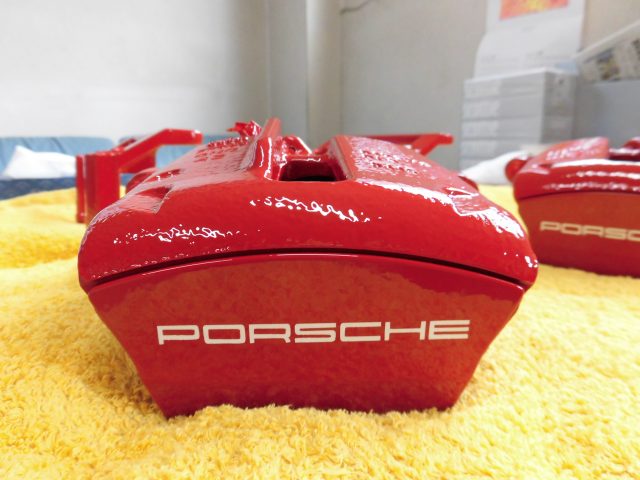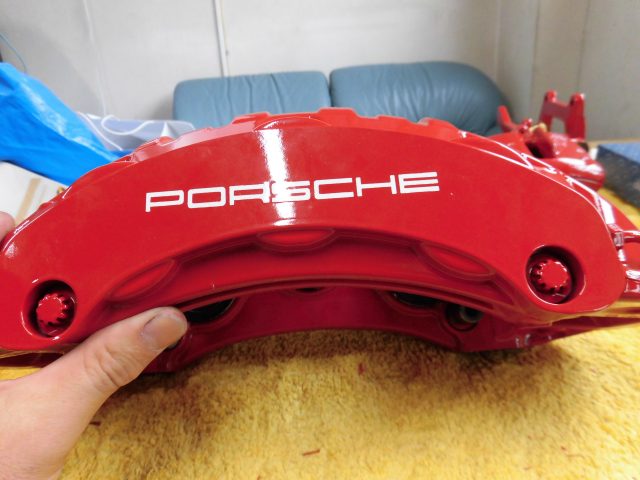 施工前 施工後 メーカーポルシェ車名・モデル修理部位・内容ブレーキキャリパー修理期間約2週間 ブレーキキャリパーの色変えです。キャリパーはブレーキから外した状態でお預かりしました。塗装すると「PORSCHE」の文字は消えてしまいますのであらかじめ文字データを取ってマスキング用シールを作成しておきます。本体の色(赤)を塗ってからマスキング用シールを使って文字を白で塗って出来上がりです。